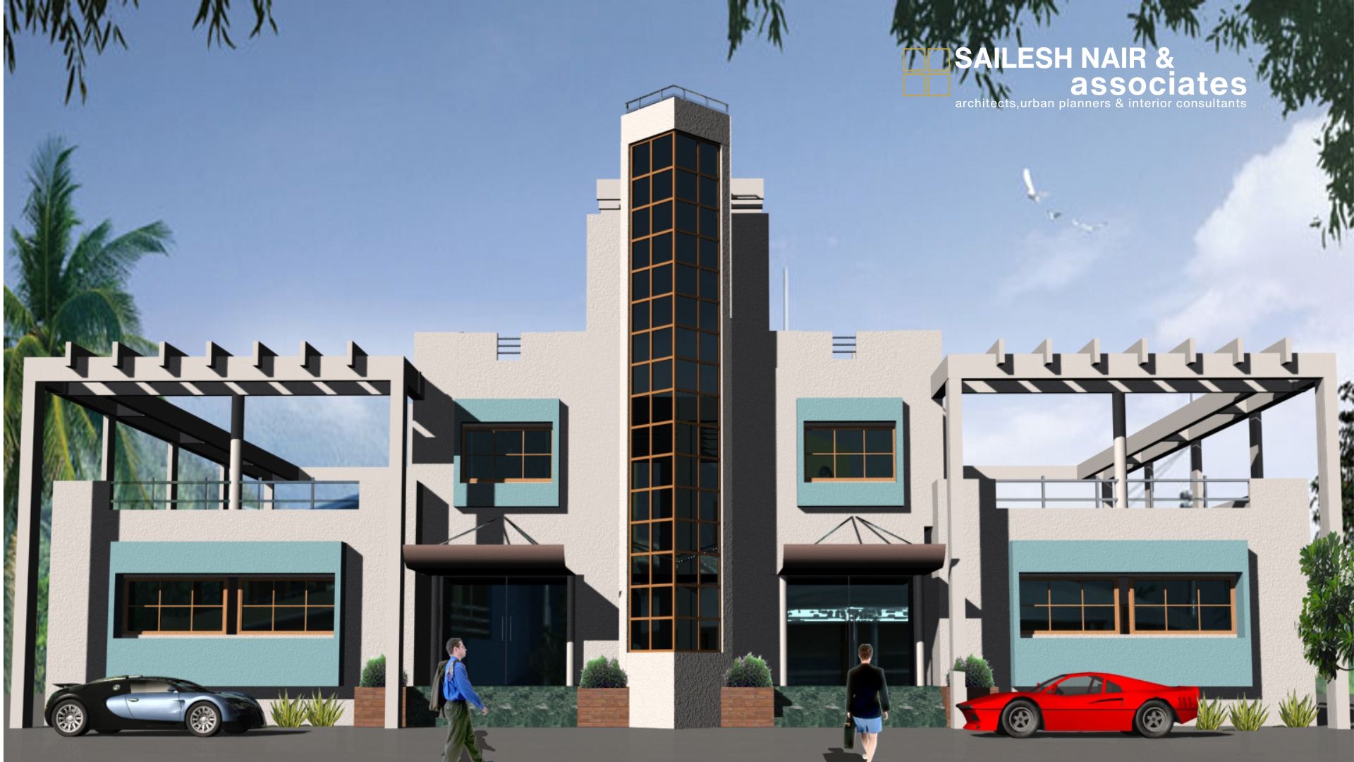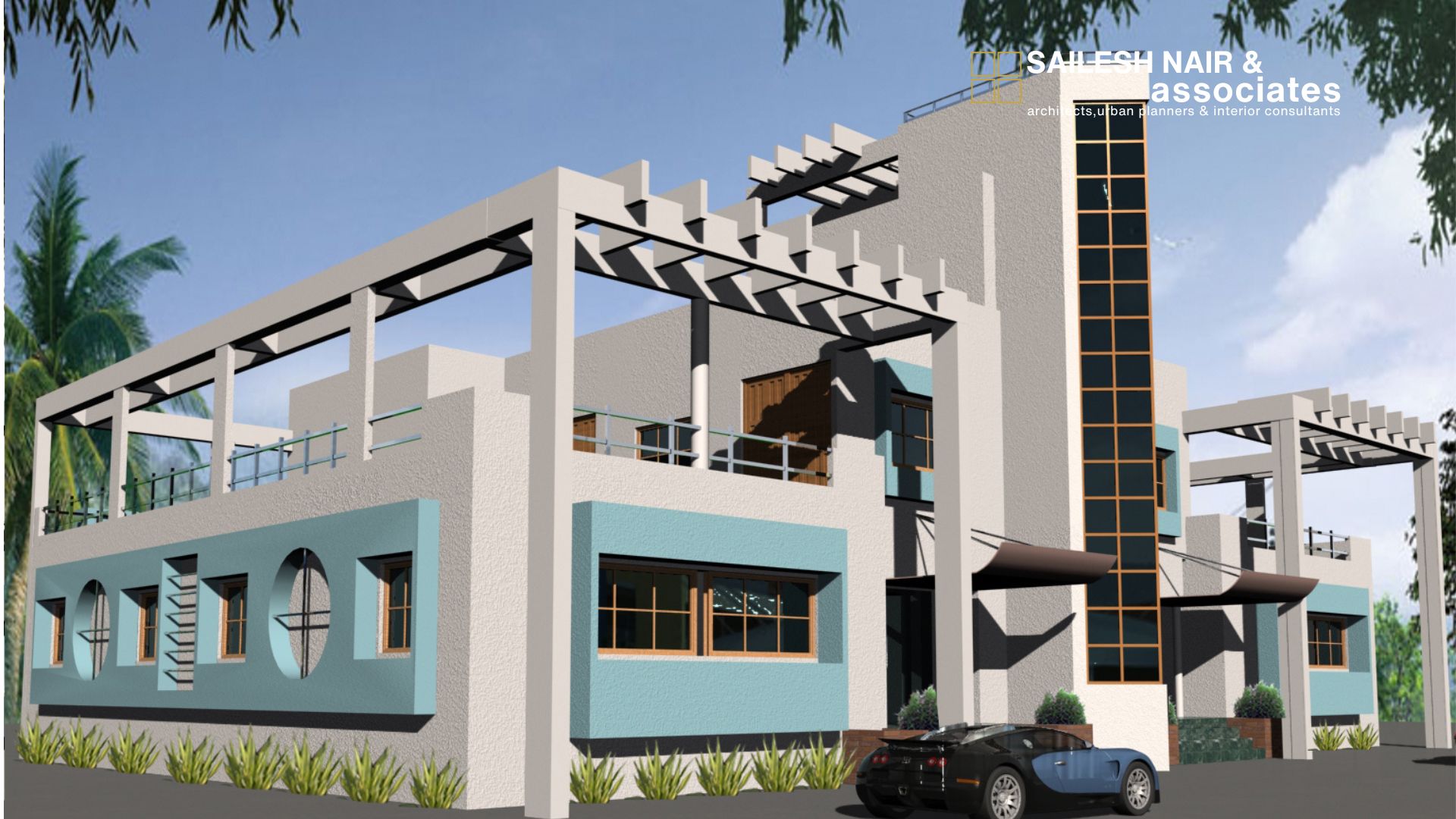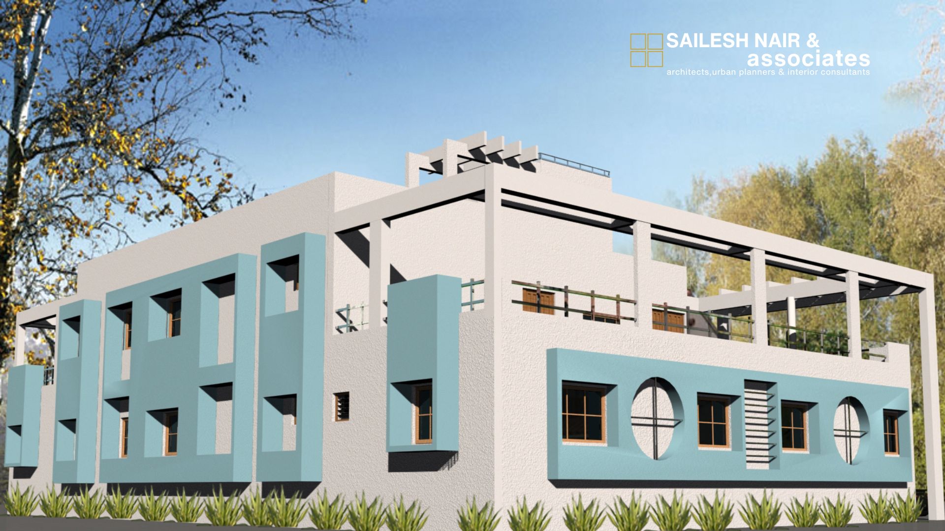 This institutional project by Sailesh Nair & Associates is designed with a strong emphasis on functionality, visibility, and modern aesthetics, creating a bold architectural identity. The structure is defined by its striking vertical tower element clad in blue panels, which not only acts as a visual anchor but also enhances the building’s presence along the street. The use of clean geometric lines, white walls, and contrasting blue highlights provides a contemporary look while maintaining simplicity and efficiency. Multiple entry points, open terraces, and projecting balconies reflect thoughtful planning to accommodate circulation, accessibility, and natural ventilation. The symmetrical layout combined with carefully placed fenestrations ensures ample daylight within interior spaces, making the environment both practical and welcoming. Surrounded by boundary fencing and greenery, this project embodies the firm’s approach to blending modern design language with utility, making it a landmark that is both recognizable and functional for the community it serves.