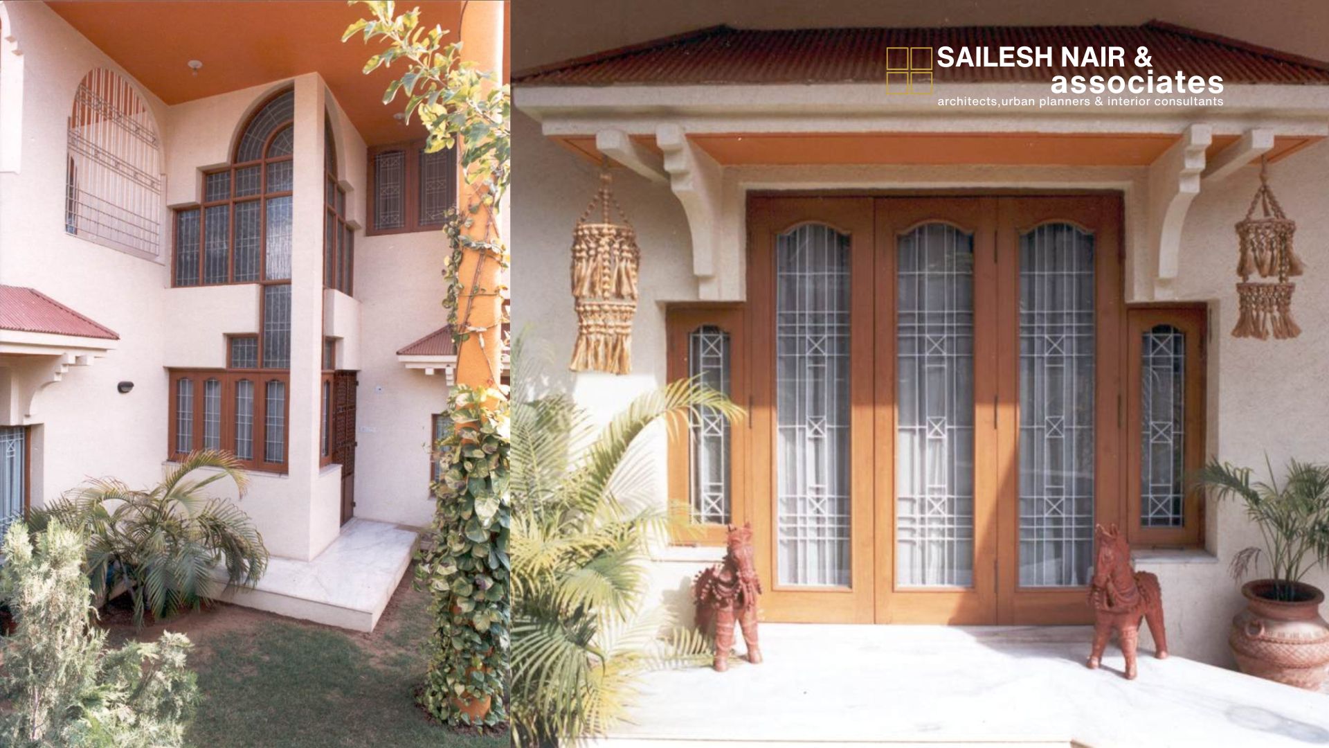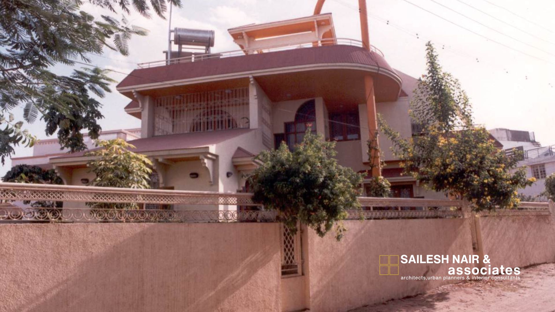This residential project by Sailesh Nair & Associates stands out for its distinctive and expressive architectural character, blending bold geometry with a sense of openness and individuality. The design employs sweeping rooflines, striking curved forms, and dramatic vertical elements that create a sculptural presence while offering functional advantages such as shade and ventilation. Large arched windows and terraces introduce natural light and connect the indoors with the outdoors, while carefully designed balconies and verandahs extend the living spaces seamlessly. The interplay of soft pastels and structural accents adds warmth and charm, reflecting both contemporary aspirations and timeless appeal. Surrounded by greenery and enclosed within a thoughtfully detailed boundary, this home represents the firm’s philosophy of creating residences that are not only visually striking but also comfortable, inviting, and deeply personal to the lifestyle of its inhabitants.