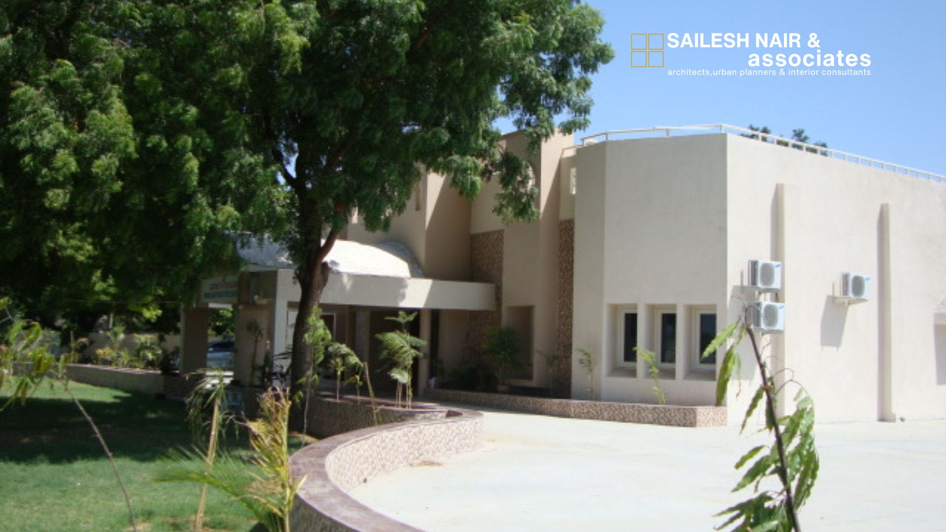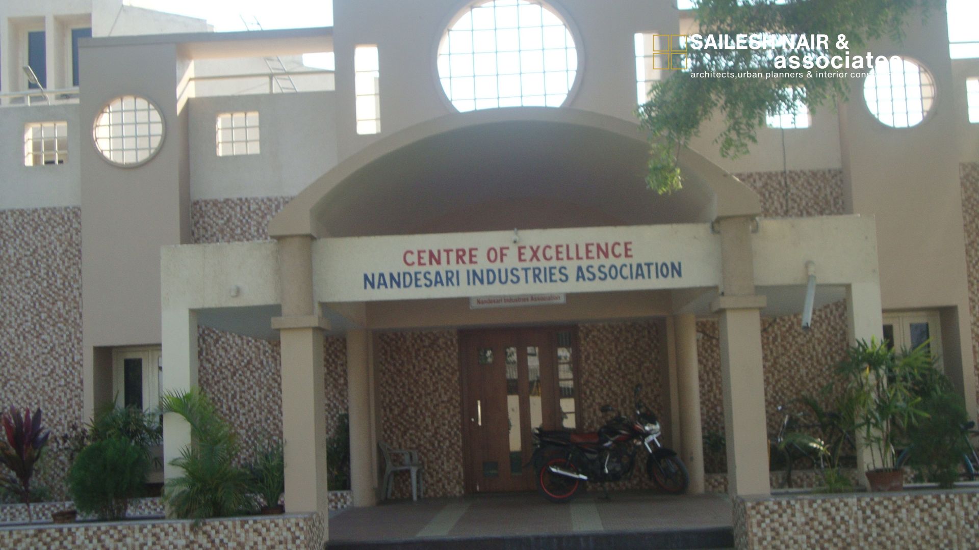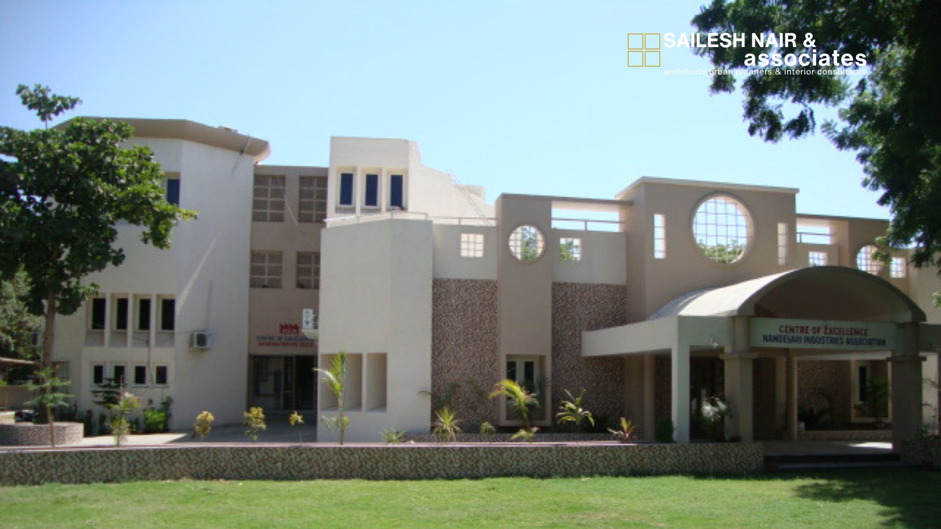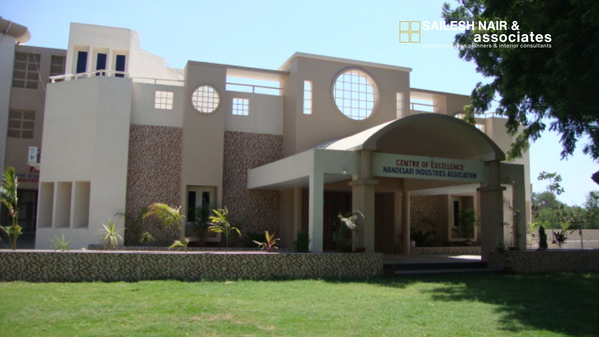 This institutional project by Sailesh Nair & Associates, the Centre of Excellence for Nandesari Industries Association, is a fine example of architecture designed to inspire learning, collaboration, and progress. The façade strikes a harmonious balance between solidity and openness, combining clean, modern lines with thoughtful detailing such as circular openings and textural stonework that lend both character and sophistication. The grand entrance, highlighted by a sweeping canopy, creates a sense of welcome and dignity, setting the tone for the activities within. Large windows and well-placed openings ensure natural light permeates the interiors, fostering a bright and engaging atmosphere for innovation and interaction. The structure is surrounded by expansive green lawns that not only enhance the aesthetic appeal but also create a refreshing environment conducive to focus and productivity. This project reflects the firm’s expertise in designing institutional spaces that are functional, iconic, and deeply connected to their purpose of serving as hubs of excellence.
