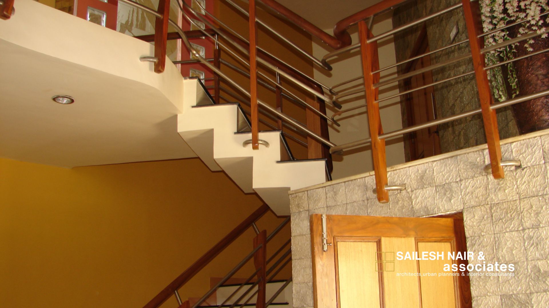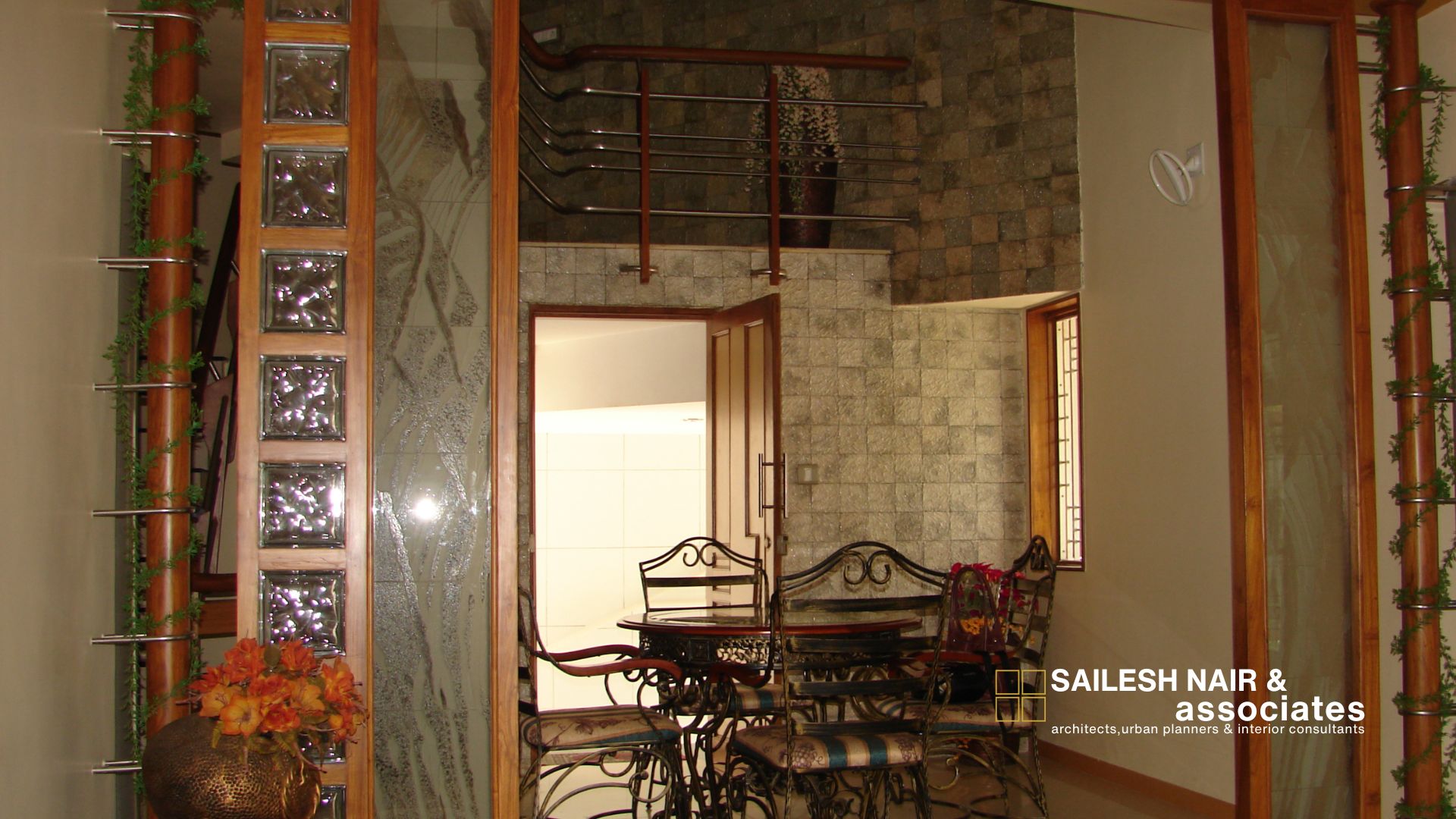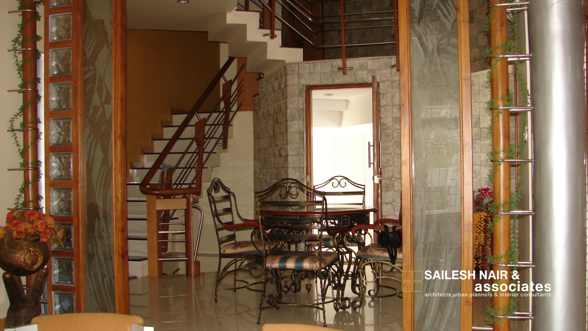 This residential interior project by Sailesh Nair & Associates demonstrates a refined balance between elegance, openness, and functional planning. The central dining area, furnished with ornate wrought-iron furniture, creates a stylish focal point that harmonizes with the surrounding architectural elements. The staircase, with its sleek wooden and metal railings, integrates seamlessly into the space, adding both vertical flow and visual depth. Use of natural stone cladding on walls enhances texture and warmth, contrasting beautifully with polished flooring and smooth finishes. Vertical wooden and glass partitions, along with decorative elements such as indoor plants and carefully placed accent pieces, provide subtle zoning while maintaining transparency and connectivity across spaces. The interplay of natural light, reflective surfaces, and earthy tones reinforces a contemporary yet timeless aesthetic. Overall, the design reflects the firm’s thoughtful approach to interiors—merging sophistication with livability while highlighting architectural features as integral elements of the home.