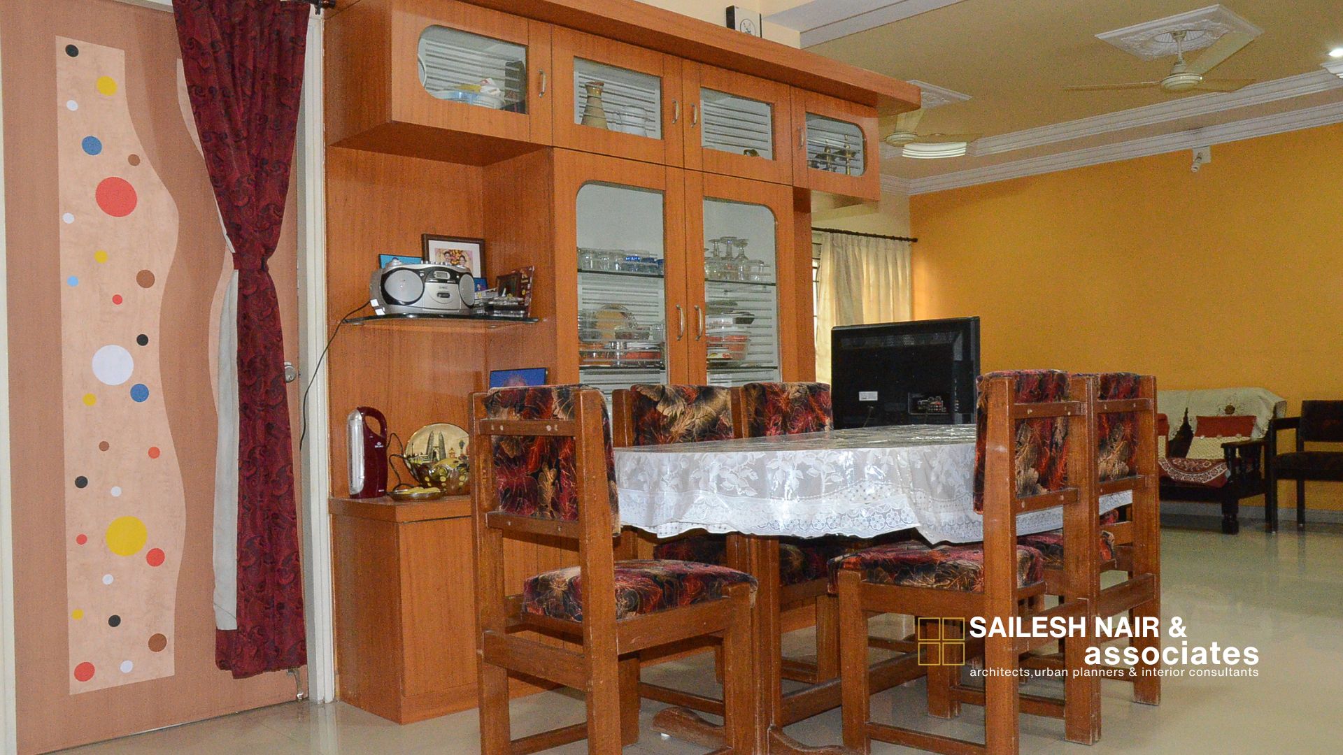 This interior design project by Sailesh Nair & Associates reflects a seamless balance between functionality and aesthetics, transforming the living-dining area into a warm and inviting space. The custom-crafted wooden cabinetry, with its elegant combination of glass-front shutters and closed storage, serves as both a practical solution for organization and a sophisticated focal point in the room. The incorporation of open display shelves adds visual interest, allowing for the tasteful showcasing of artifacts, décor, and personal collections, while the adjoining niche wall detail enhances the architectural richness of the space. The dining area is thoughtfully integrated with upholstered seating that complements the warm wood tones, creating an environment ideal for family gatherings and entertaining guests. Accents such as the wall-mounted television unit, subtle lighting, and curated decorative elements further elevate the design, adding layers of comfort and personality. Every detail of this project highlights the firm’s expertise in creating interiors that are not only visually appealing but also highly functional, tailored to the lifestyle and cultural preferences of the homeowner.