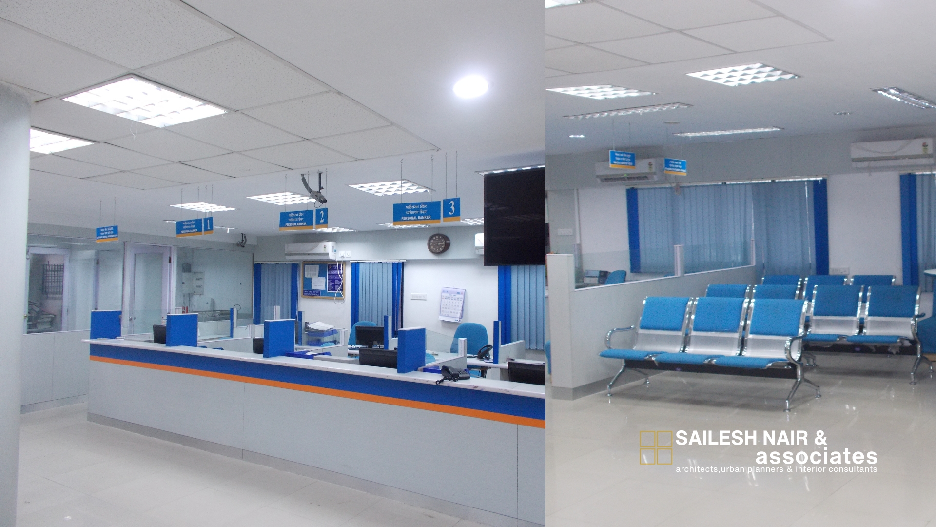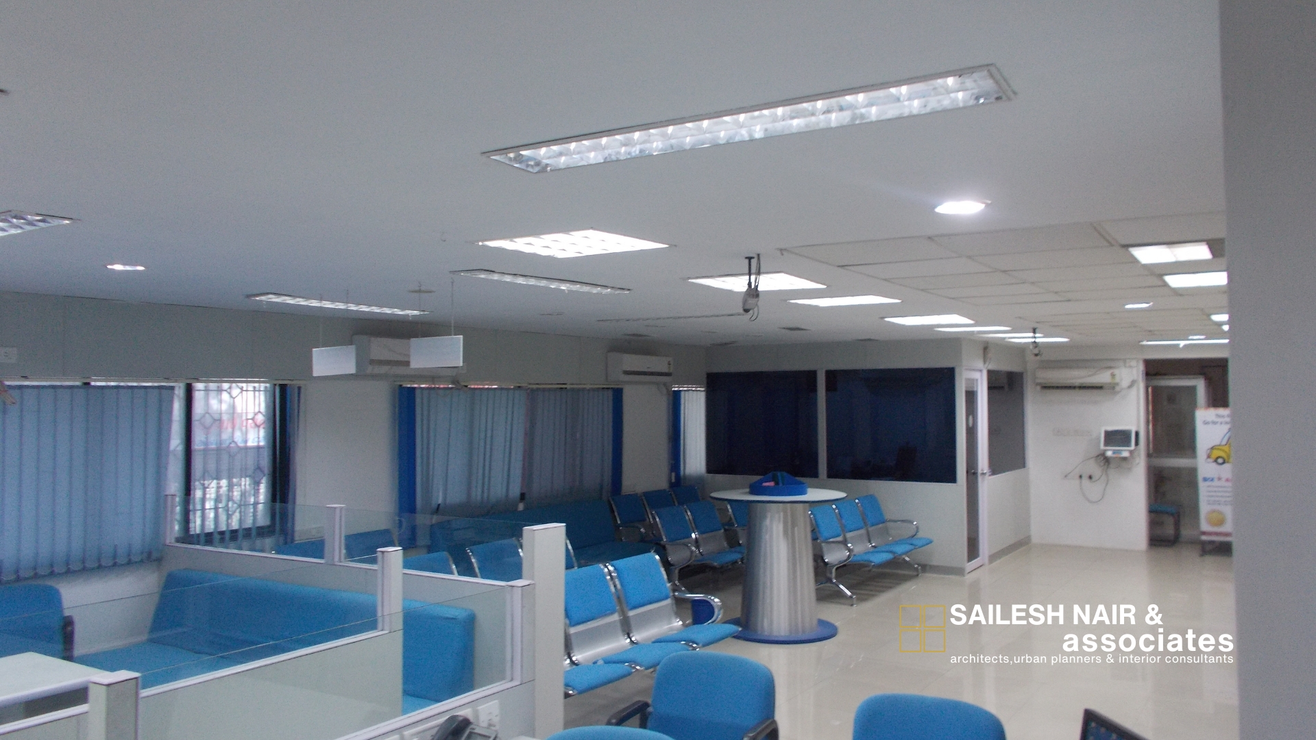 This corporate office interior by Sailesh Nair and Associate is thoughtfully designed to create a highly functional, efficient, and welcoming work environment. The open-plan layout features modular workstations with clean partitions that promote both collaboration and privacy, while ergonomic seating enhances employee comfort. A consistent color scheme of crisp white surfaces accented with blue tones adds freshness and vibrancy, reflecting a professional yet dynamic brand identity. The use of glass partitions and transparent enclosures allows natural light to flow across the space, reinforcing openness while maintaining defined zones for staff and clients. Integrated storage units, organized cabling, and strategically positioned desks ensure a clutter-free, streamlined workspace. Bright overhead lighting and carefully planned circulation further contribute to an organized, modern, and high-performance office environment that reflects clarity, transparency, and forward-thinking design.