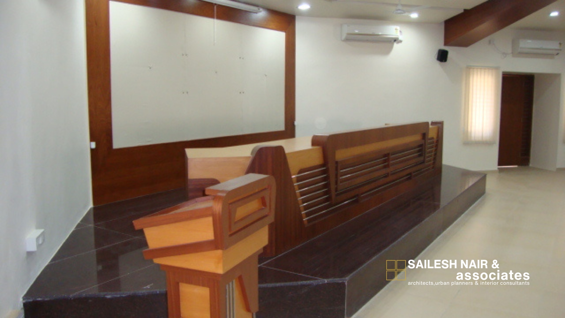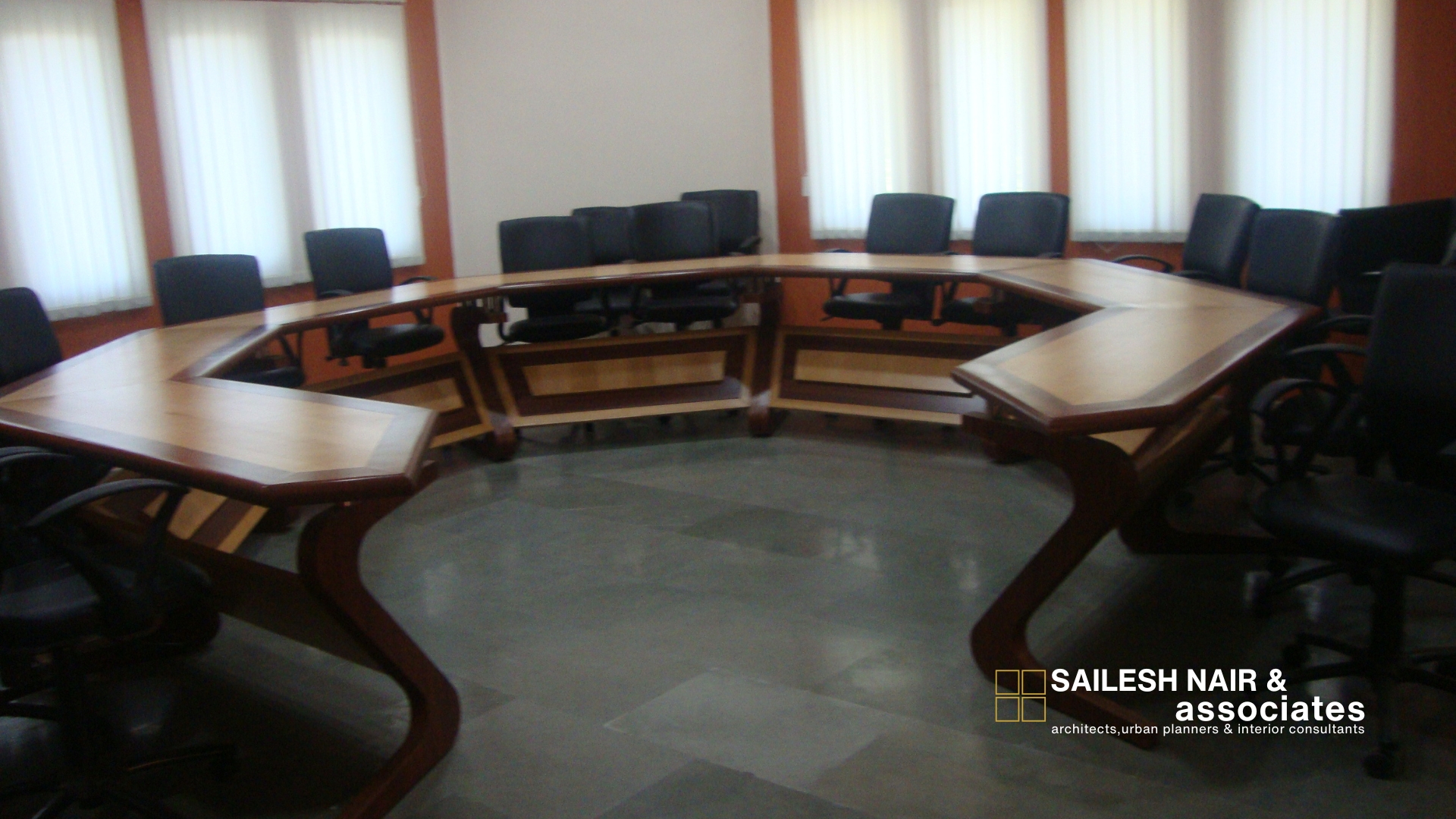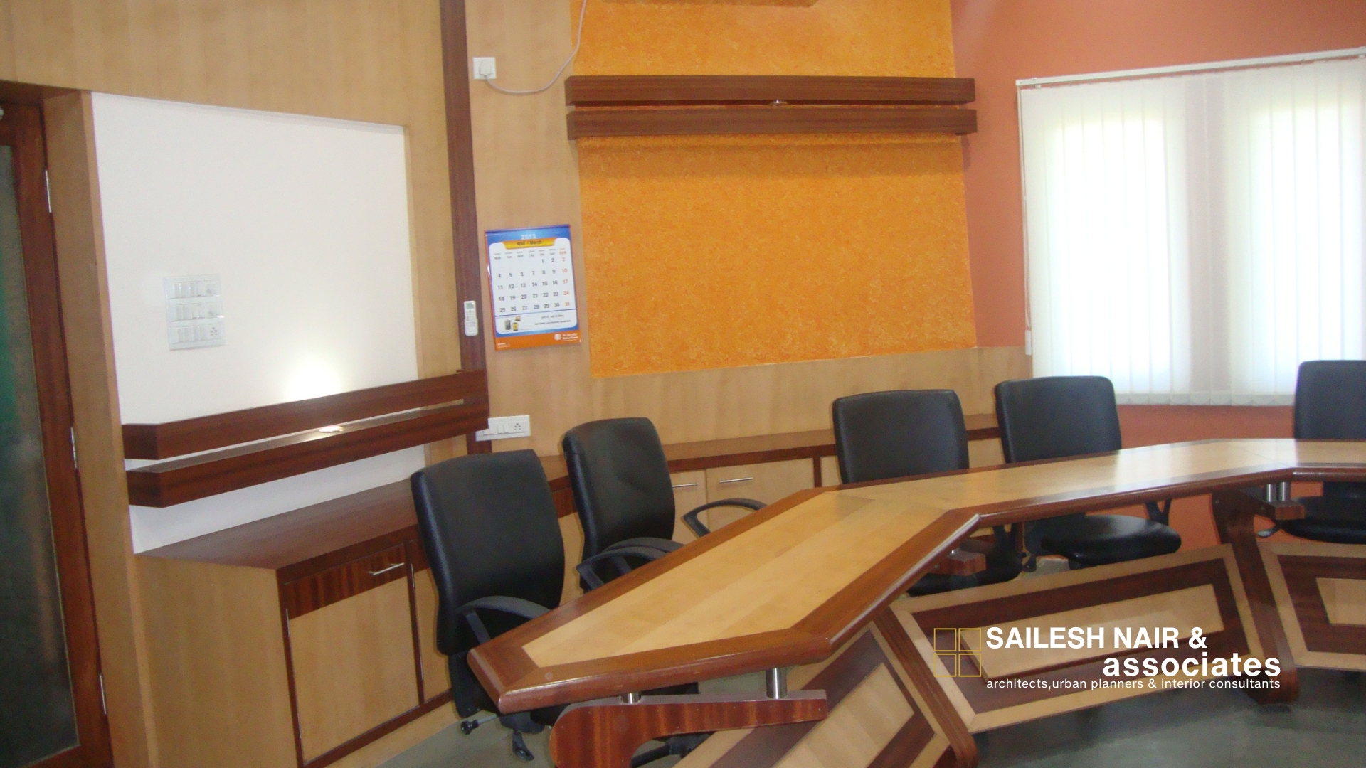 This interior project by Sailesh Nair and Associate demonstrates a refined approach to workplace design, combining modern aesthetics with practical functionality. The space is arranged with custom-built modular furniture, including angular wooden desks paired with ergonomic seating to encourage collaboration and comfort. The use of natural wood finishes with contrasting accents adds warmth and sophistication, while the sleek storage units and integrated shelving ensure a clutter-free environment. The bold ceiling treatment, in a warm hue, not only adds character but also visually anchors the space, enhancing its sense of identity. Ample natural and artificial lighting work together to create a bright, welcoming atmosphere, while clean lines and subtle detailing reinforce the professional tone. Designed with precision and adaptability, this interior reflects a balance of elegance and utility, perfectly suited for dynamic working environments.
