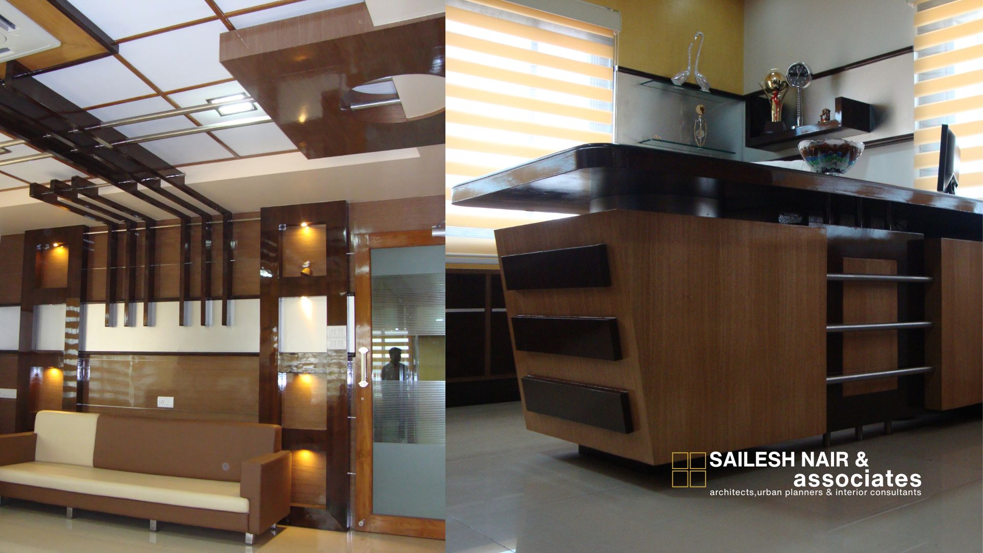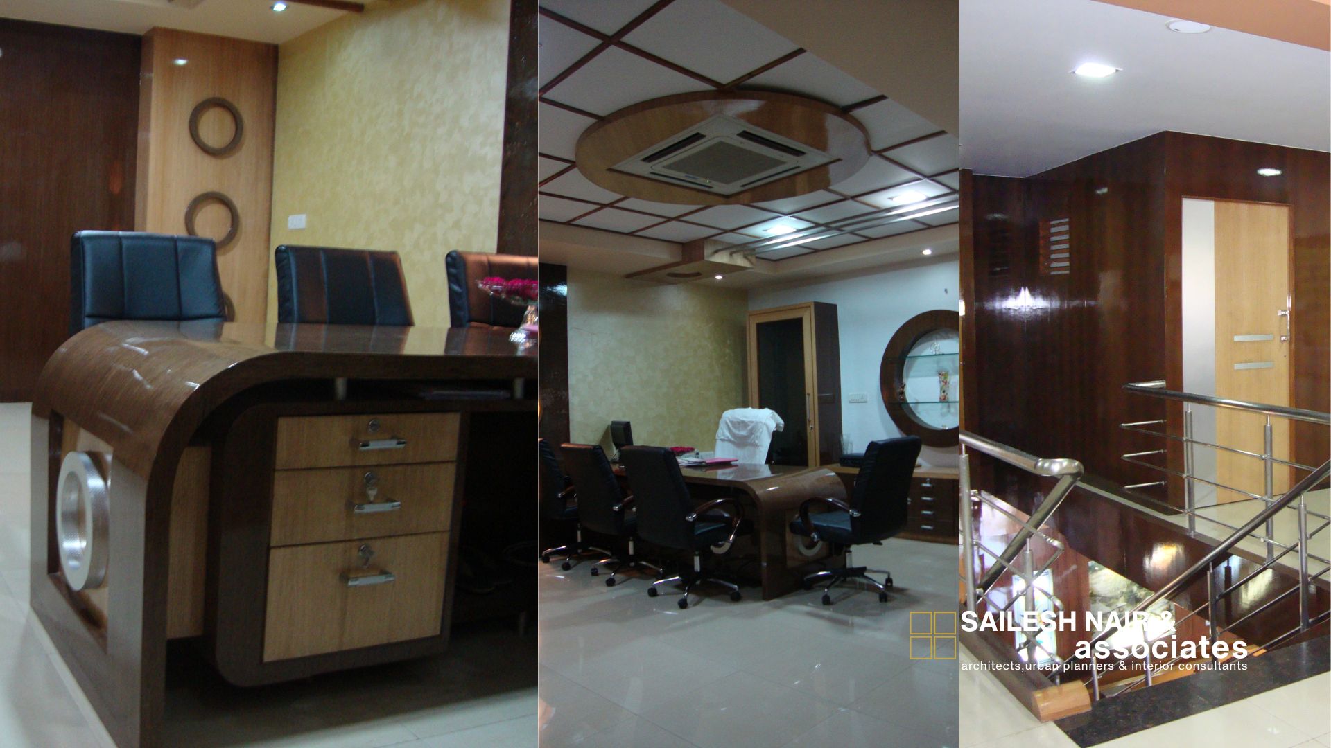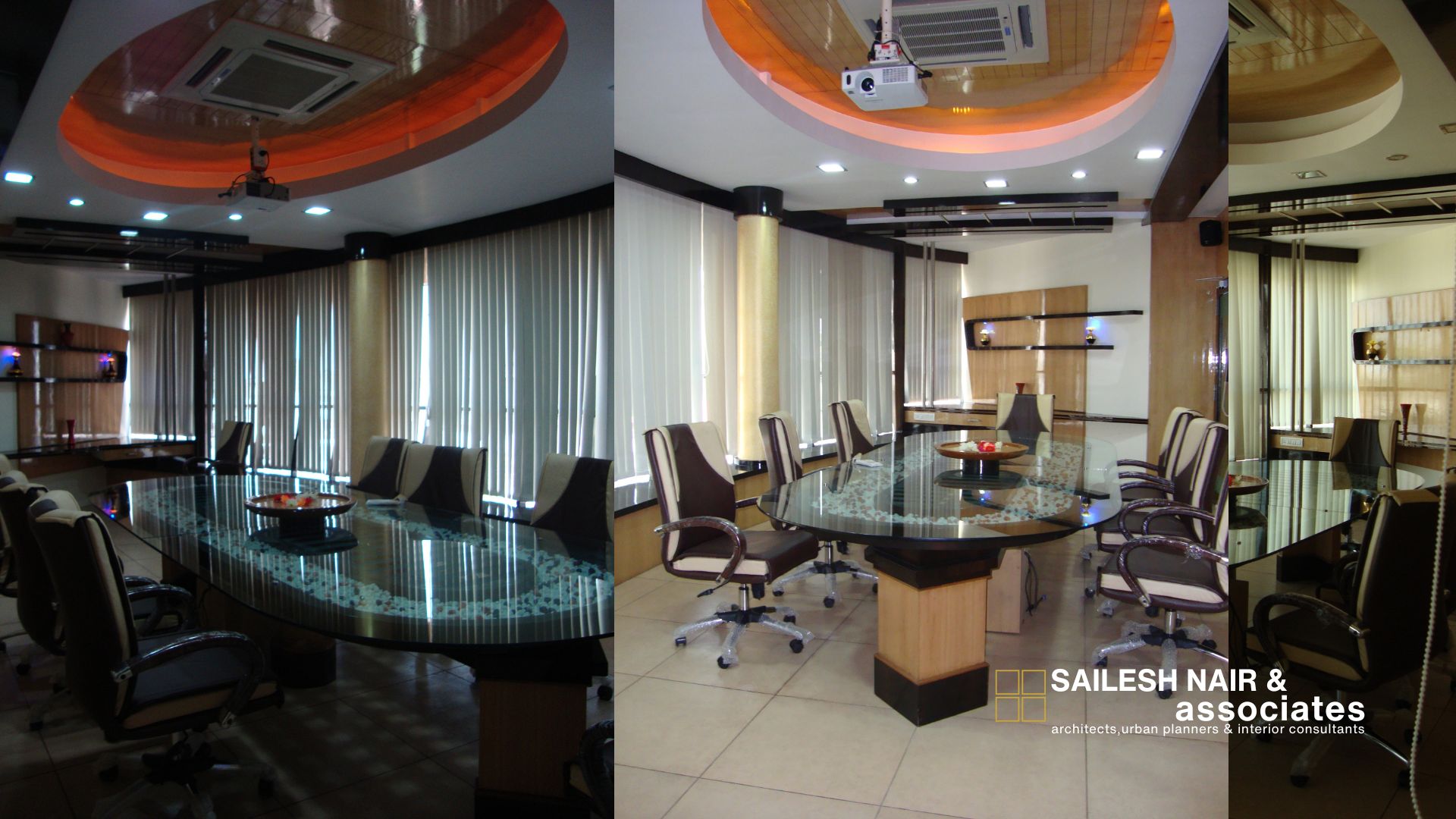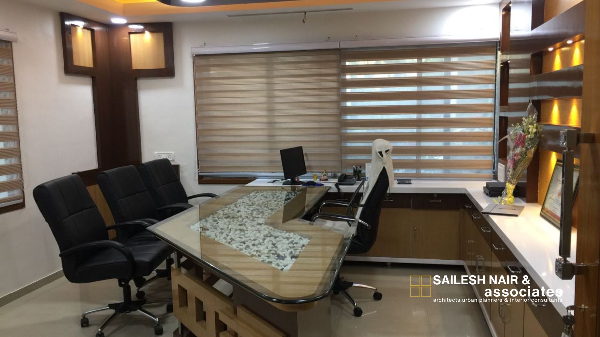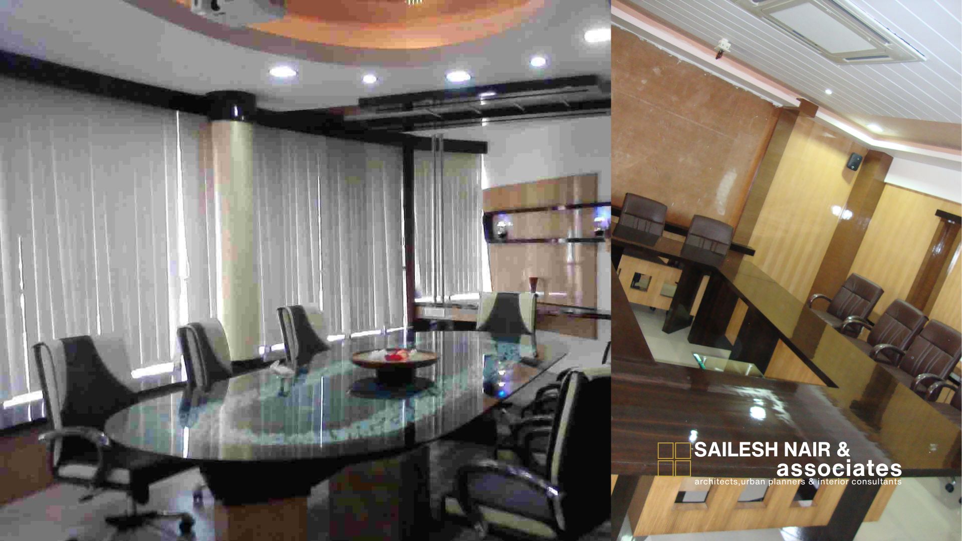 This interior project by Sailesh Nair and Associates showcase a sophisticated blend of modern aesthetics and functional design, creating a refined workspace environment. The ceiling design, with its geometric wooden panels and suspended beams, adds depth and visual interest while complementing the rich wooden wall finishes. A harmonious balance of warm tones and sleek surfaces enhances the professional yet welcoming atmosphere. The custom-designed furniture, including the comfortable seating and integrated storage, maximizes utility without compromising on style. Large windows with contemporary blinds bring in natural light, while strategically placed lighting highlights the textures and details of the space. Overall, the design reflects a perfect union of elegance, practicality, and innovation—an ideal setting that elevates both productivity and comfort.
